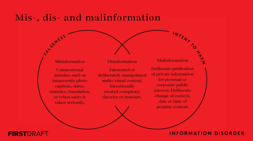 "Disinformation is content that is intentionally false and designed to cause harm. It is motivated by three distinct factors: to make money; to have political influence, either foreign or domestic; or to cause trouble for the sake of it. When disinformation is shared it often turns into misinformation. Misinformation also describes false content but the person sharing doesn’t realise that it is false or misleading. Often a piece of disinformation is picked up by someone who doesn’t realise it’s false, and shares it with their networks, believing that they are helping… The third category we use is malinformation. The term describes genuine information that is shared with an intent to cause harm. An example of this is when Russian agents hacked into emails from the Democratic National Committee and the Hillary Clinton campaign and leaked certain details to the public to damage reputations.”