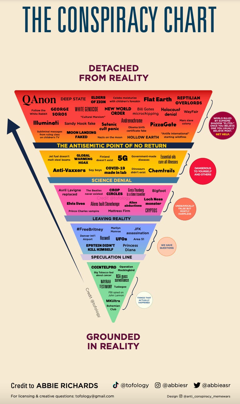 Although she couldn’t be defined as a traditional fact-checker, her work serves a similar purpose in helping to combat viral falsehoods online. Not all innovation has to involve machine learning. She has created an inverted pyramid describing various falsehoods which she calls The Conspiracy Chart: