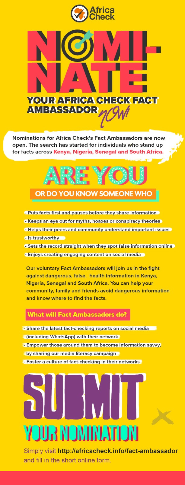There are other ways of getting people to take part. For example Africa Check is running a campaign for voluntary Fact-Check Ambassadors to foster a culture of media literacy and exposure to the latest work of fact-checkers: